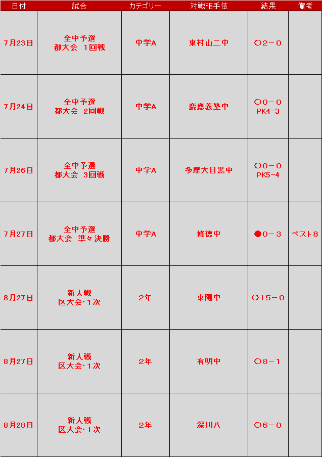夏休み期間で試合数が多いため、公式戦を中心にご報告致します。夏休み始め全中都大会でしたが、東京都ベスト8で大会を終了致しました。何よりも、サッカーを通し、チームが結束したことが最も良く、これからのTリーグそして、今週末行われる高円宮杯2回戦に集中してもらいたいです。