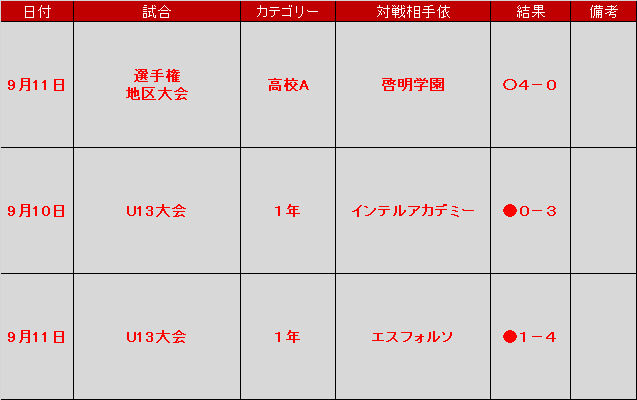 9月10、11日に行われました試合のご報告です。高校生は選手権予選代表決定戦に進んでおります。各カテゴリー、公式戦が続きます。集中しましょう。